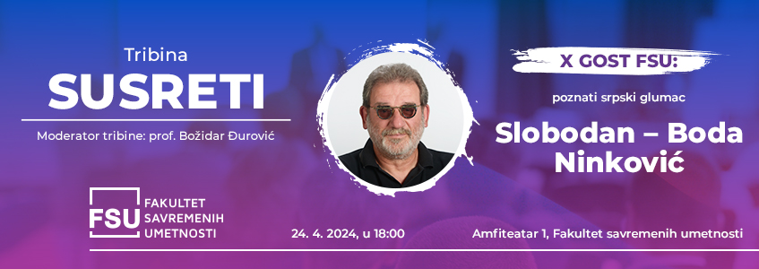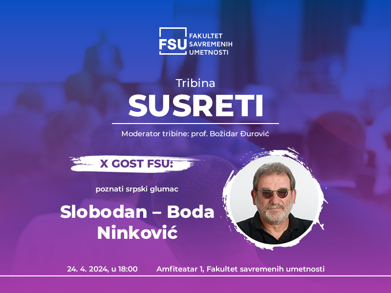 Tim povodom vas pozivamo da budete gosti desete tribine „Susreti”, koja će se održati u sredu, 24. aprila, sa početkom u 18 časova, na Fakultetu savremenih umetnosti u Amfiteatru 1.