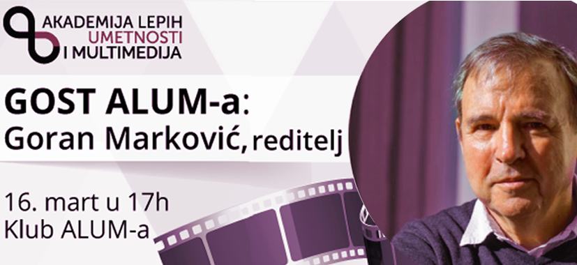Zadovoljstvo nam je da vas obavestimo da će Akademija lepih umetnosti i multimedija ugostiti našeg proslavljenog reditelja Gorana Markovića, u četvrtak, 16. marta, u prostorijama Kluba ALUM-a.