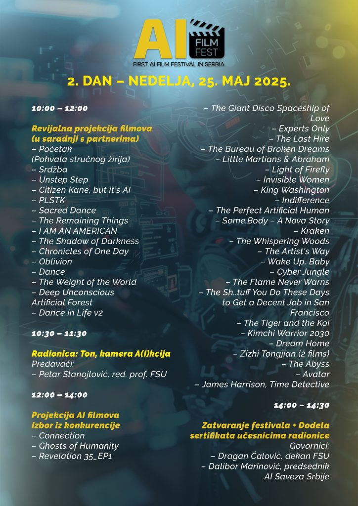 - Projekcije inovativnih filmova generisanih pomoću AI-a,