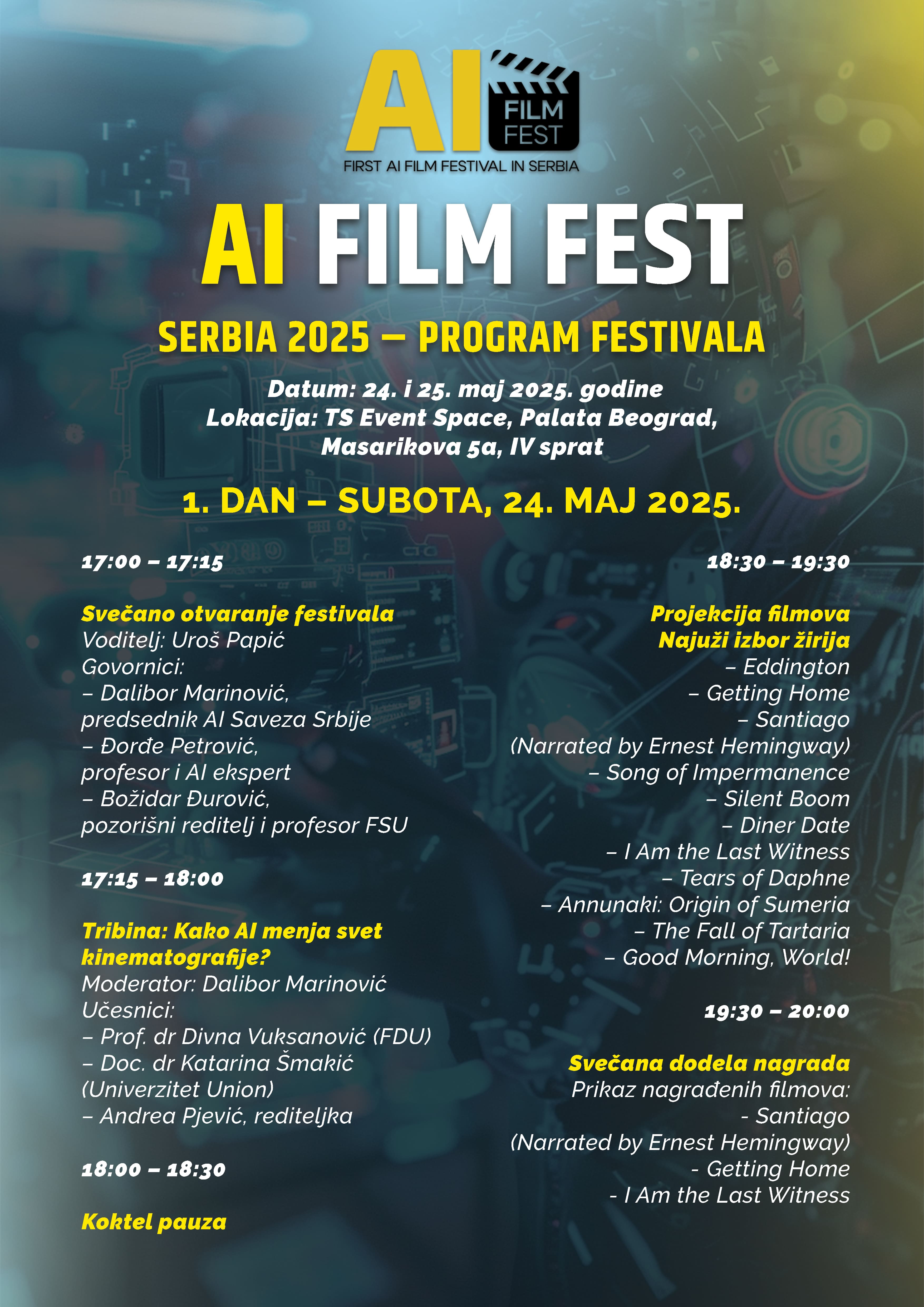 Pridružite se AI FilmFest Serbia i postanite deo istorije inovacija u filmskoj industriji. Bez obzira da li ste kreator, entuzijasta ili ljubitelj umetnosti, ovo je događaj koji ne smete propustiti. Vidimo se na Festivalu!