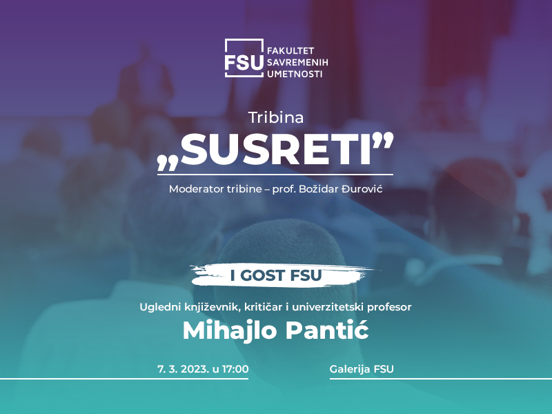 Fakultet savremenih umetnosti vas poziva da posetite Galeriju FSU, u utorak, 7. marta, u 17h, i iskoristite priliku da upoznate jednog od najcenjenijih književnika na ovim prostorima – profesora Mihajla Pantića.