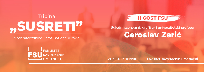 Pridružite se druženju u okviru nove tribine „SUSRETI”, u utorak, 21. marta, u 17 časova, i iskoristite priliku da lično upoznate cenjenog srpskog scenografa i univerzitetskog profesora Geroslava Zarića i učestvujete u zanimljivoj i poučnoj diskusiji sa njim.