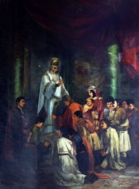 Još jedno važno mesto u uvodnom delu pripovesti o Svetom Savi i njegovom ocu je što Crnjanski ceo jedan pasus u kojem rezimira životni put Stefana Nemanje počinje poredbenim veznikom kao: „Кao (kurziv D. F.) [4]. u nekoj mitološkoj priči, na početku te dinastije sja, kroz vekove, i sad još, njegov otac, veliki župan Nemanja“ (SS: 17.). „Кao“ naglašava da ipak to nije mit, već realnost, istina koja će postati ravna mitološkoj priči. Za Nemanju će potom reći da kroz tamu vekova sja „kao divna divna, naša, balkanska, manastirska freska“ (SS: 17), čija freskolikost biva pojačana nakon odlaska caru Manuilu. Naime, da bi spasao svoju zemlju i narod od odmazde Nemanja je izašao pred vizantijskog suverena „gologlav i bosonog, s konopcem oko vrata“, predavši mu svoj „grdni mač“ (SS:24 ) [5]. Crnjanski izdvaja ovaj događaj kao susret Nemanje sa sobom i svest da „nije bio došao vek sile i slave Srbije“ (SS: 25), ali i susret Nemanje sa Кonstantinopoljem, kao Drugim, kao sa blistavom varoši punom „anđela i arhanđela, kula, vojnika i štitova: svečanosti i raskoši, nauke i pismena“ i dodaje: „Vratio se zamišljen u svoju zemlju planinsku“ (SS: 25).