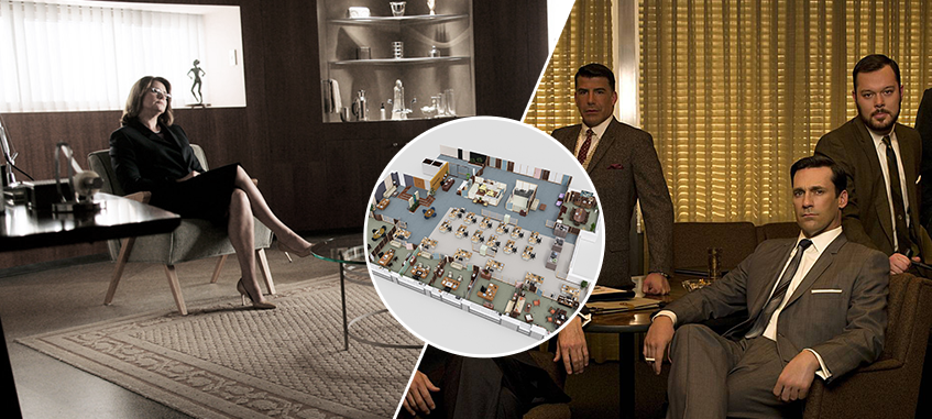 Slična podela po rodnoj logici prisutna je i u Momcima sa Medison avenije. Kada su u pitanju muškarci, značajni deo dinamike vrti se oko distribucije kancelarijskog prostora – kako se pozicija, oblik i veličina kancelarije smatraju direktno proporciolnim statusu i značaju, tako je prostor deo stalnog nadmetanja, pregovaranja, pa čak i podmićivanja.