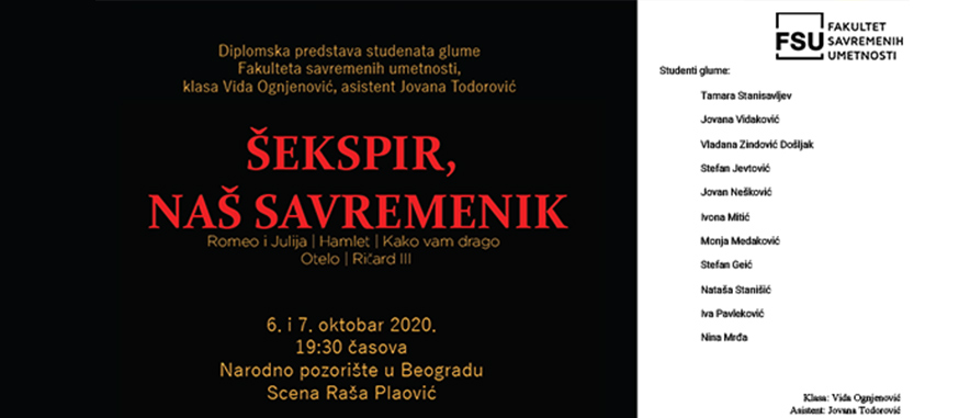 Studenti glume u klasi Vide Ognjenović i asistenta Jovane Todorović svoju diplomsku predstavu „Šekspir – naš savremenik” odigrali su na Sceni „Raša Plaović” u Narodnom pozorištu.