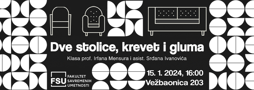 Studenti treće godine osnovnih studija glume će u ponedeljak, 15. januara, od 16 časova, izvesti predstavu „Dve stolice, krevet i gluma” u Vežbaonici 203.