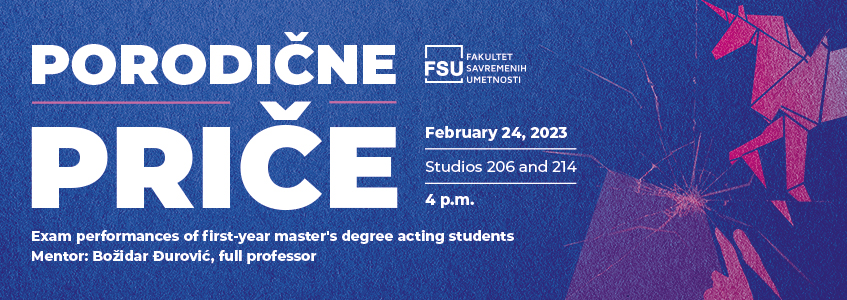 On February 24, first-year master’s degree acting students performed two pieces as part of the exam performance “Porodične priče”. The exam took place in studios 206 and 214 at the Faculty of Contemporary Arts (12 Svetozara Miletića Street).
