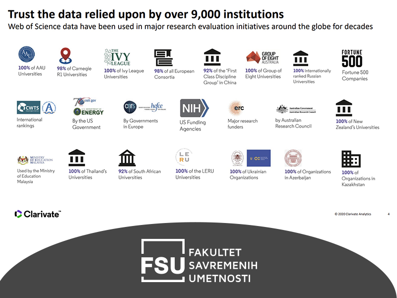 Preko 9.000 vodećih naučnih, korporativnih i državnih institucija i milioni istraživača koriste Web of Science kako bi obavili najkvalitetnija istraživanja, stekli dragocene uvide i doneli prave odluke koje se tiču budućnosti njihovih institucija i istraživačkih strategija.