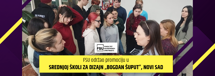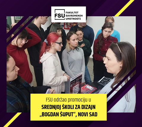 Fakultet savremenih umetnosti (FSU) održao je info-sesiju u Srednjoj školi za dizajn Bogdan Šuput u Novom Sadu, gde su učenici imali priliku da se upoznaju sa studijskim programima iz oblasti savremene umetnosti, dizajna, glume, režije i multimedije.