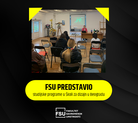 U utorak, 11. decembra, Fakultet savremenih umetnosti održao je prezentaciju u Školi za dizajn u Beogradu, gde su učenici završnih razreda imali priliku da saznaju više o mogućnostima koje FSU nudi mladim kreativcima. Tokom 30-minutne info-sesije govorilo se o studijskim programima, konkursima, umetničkim projektima i savremenim praksama u kreativnim industrijama.