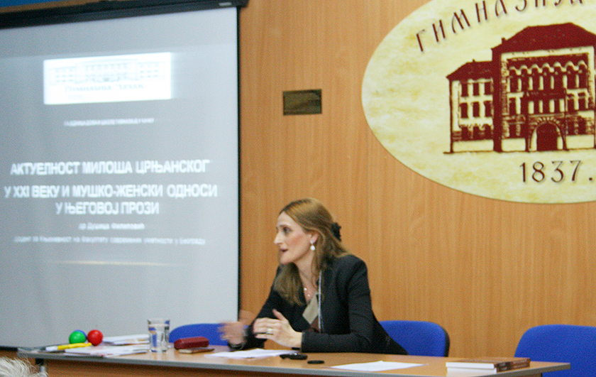 U svom predavanju Aktuelnost Miloša Crnjanskog u 21. veku i muško-ženski odnosi u njegovoj prozi, održanom u Svečanoj sali Gimnazije, doc. dr Dušica Filipović, inače bivši đak ove vrsne škole, čačanskoj publici je 11. decembra 2017. osvetlila figuru velikog, ako ne i najvećeg srpskog pisca, Miloša Crnjanskog.