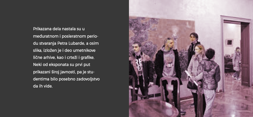Posle Kuće legata, mladi umetnici posetili su Dom Jevrema Grujića kako bi videli izložbu „Neviđeni Lubarda“. Na izložbi, kojom se obeležava 110 godina od rođenja jednog od najvećih jugoslovenskih umetnika, Petra Lubarde, posetioci su videli čak 24 dela pozajmljena iz kolekcija Kuće legata, Galerije Matice srpske, Medija centra „Odbrana“, Vojske Srbije, Narodnog muzeja Pančeva, kao i iz šest privatnih kolekcija.