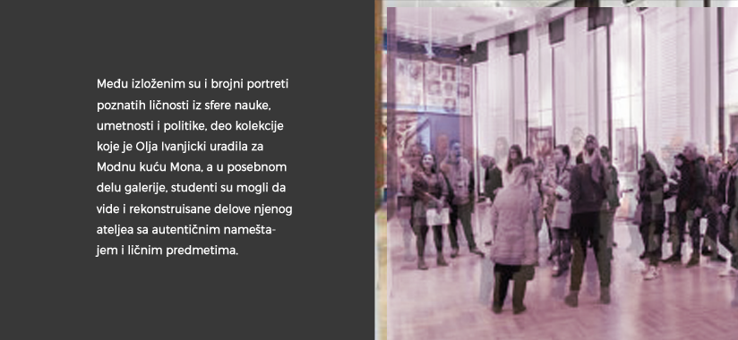 Poslednja destinacija u kulturnom obilasku bio je Istorijski muzej Srbije i izložba „Zaostavština Olje Ivanjicki“, gde su, uz njena umetnička dela, premijerno predstavljeni autentični predmeti iz stvaralačke svakodnevice poznate srpske umetnice. Studenti su na izložbi, pored Oljinih ličnih predmeta, mogli da vide još i brojna dela: gotovo 200 umetničkih slika, skulptura i crteža.