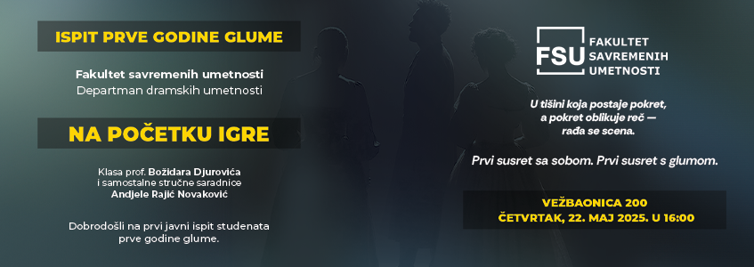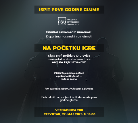 Prvi javni ispit studenata prve godine glume u klasi prof. Božidara Djurovića i stručne saradnice Anđele Rajić-Novaković biće održan u četvrtak, 22. maja 2025. godine u 16:00 časova, u vežbaonici 200 na Fakultetu savremenih umetnosti.