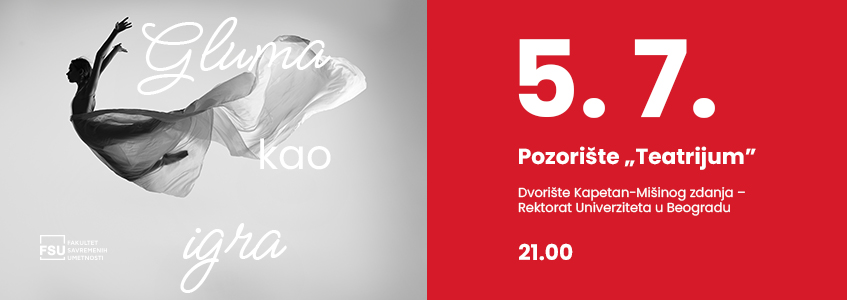 Fakultet savremenih umetnosti sa ponosom poziva sve ljubitelje pozorišta na ispitnu predstavu studenata prve godine glume „Gluma kao igra”, u klasi profesora Slobodana Beštića i asistenta Nikoline Marinković.