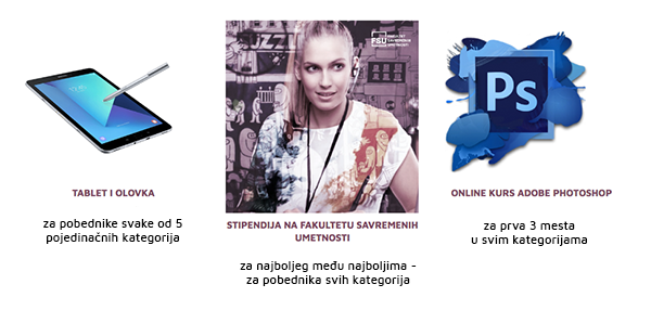 Najuspešniji u svih pet kategorija biće nagrađeni tabletom sa olovkom, dok su kursevi Photoshopa obezbeđeni za drugo i treće mesto u svakoj kategoriji. Najbolji među najboljima, apsolutni pobednik svih pet kategorija, osvaja prvu nagradu – školovanje na Fakultetu savremenih umetnosti.