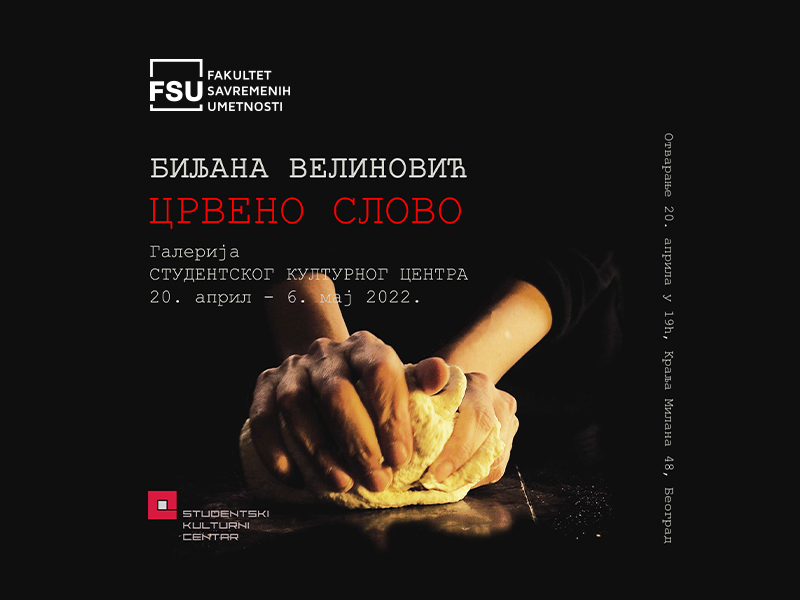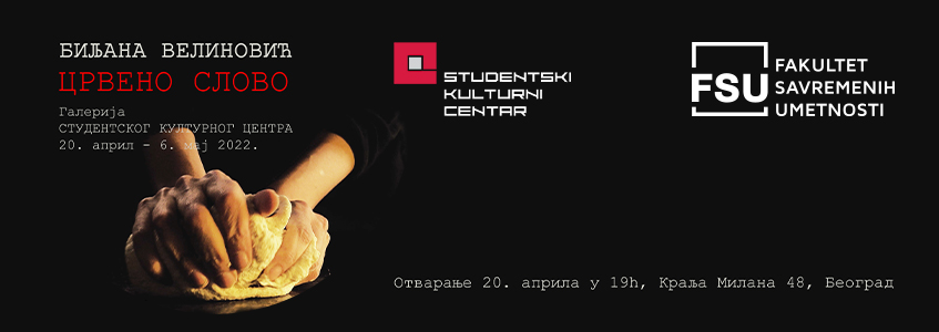 Profesorka slikarstva na Fakultetu savremenih umetnosti Biljana Velinović autorka je izložbe „Crveno slovo”, koja će u sredu, 20. aprila, od 19 časova biti otvorena u Galeriji Studentskog kulturnog centra (Kralja Milana 48).
