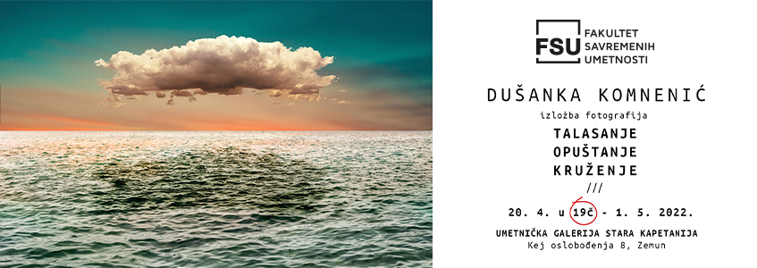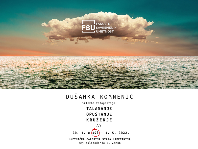 Profesorka Fakulteta savremenih umetnosti Dušanka Komnenić autorka je izložbe fotografija „Talasanje, opuštanje, kruženje”, koja će biti otvorena u sredu, 20. aprila, u 19 časova u Umetničkoj galeriji „Stara kapetanija” (Kej oslobođenja 8, Zemun).