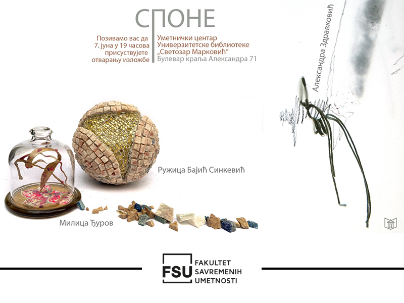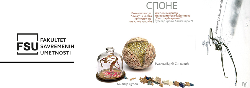 Izložba radova „Spone” Ružice Bajić Sinkević, profesorke Fakulteta savremenih umetnosti, Milice Đurov, profesorke Fakulteta primenjenih umetnosti, i Aleksandre Zdravković, samostalne umetnice, biće otvorena u utorak, 7. juna, u 19:00, u Umetničkom centru Univerzitetske biblioteke „Svetozar Marković” (Bulevar kralja Aleksandra 71).