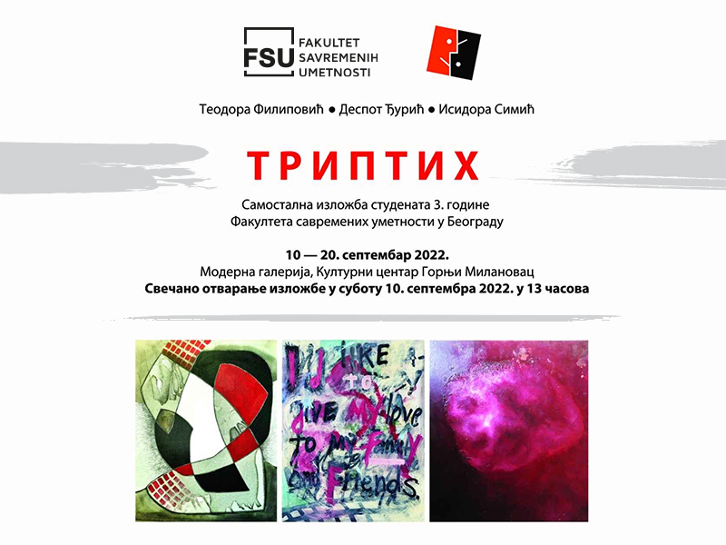 Studenti treće godine slikarstva na Fakultetu savremenih umetnosti Teodora Filipović, Despot Đurđić i Isidora Simić pozivaju vas da pogledate njihovu samostalnu izložbu „Triptih”, koja je postavljena u Modernoj galeriji Kulturnog centra Gornji Milanovac do 20. septembra.