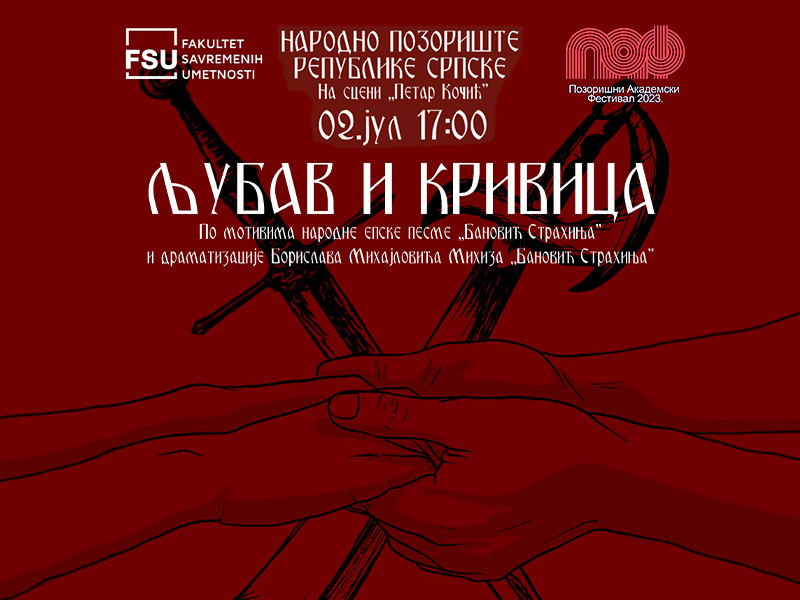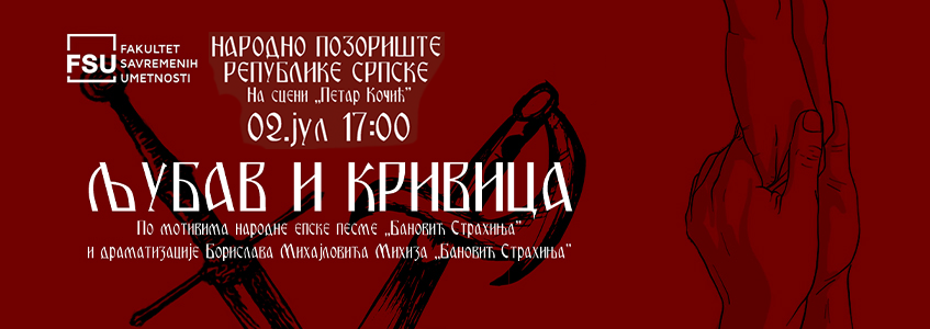 Studenti glume sa Fakulteta savremenih umetnosti pozivaju vas da pogledate njihovu predstavu „Ljubav i krivica”, koju će izvesti u nedelju, 2. jula, s početkom u 17:00, na sceni „Petar Kočić” u Narodnom pozorištu Republike Srpske. Ovo pozorišno ostvarenje, inspirisano Mihizovom dramom „Banović Strahinja” i nastalo pod budnim okom profesorke Vide Ognjenović i asistenta Mila Lekića, otvara večnu raspravu o odnosu ljubavi i dužnosti i pokreće temu krivice i praštanja.