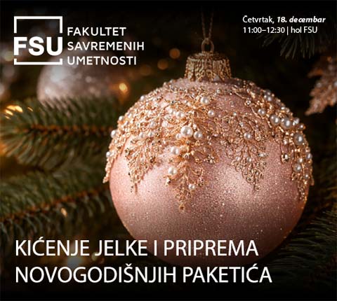 U četvrtak, 18. decembra, u holu Fakulteta savremenih umetnosti biće organizovano kićenje novogodišnje jelke, uz zajedničku pripremu paketića za decu iz Svratišta i Prihvatilišta za decu Beograda.