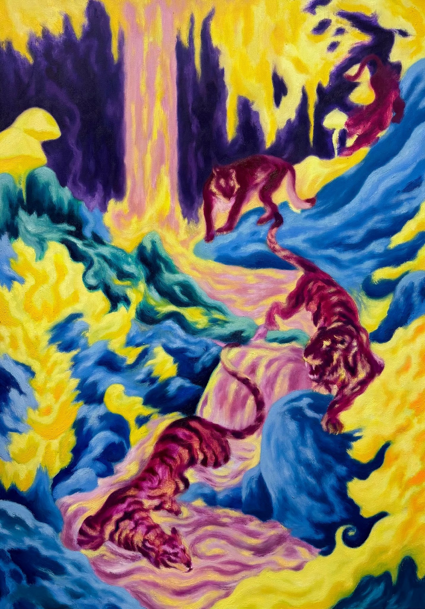 The works exist in a state of transition — between disappearance and becoming, darkness and light, dream and reality. Through vibrant neon-pastel tones, landscapes and archetypes emerge from both the conscious and subconscious.