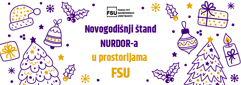 Na fakultetu savremenih umetnosti će od ponedeljka, 8. decembra, zaključno sa sredom, 10. decembra, u holu fakulteta biti postavljen novogodišnji štand NURDOR-a. Na ovom štandu naći će se različite rukotvorine organizacije NURDOR.