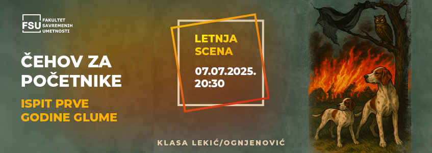 Ispit prve godine glume u klasi docenta Mila Lekića i profesorke emeritus Vide Ognjenović, 7.7.2025. Letnja scena Fakulteta Savremenih Umetnosti, početak 20 i 30.