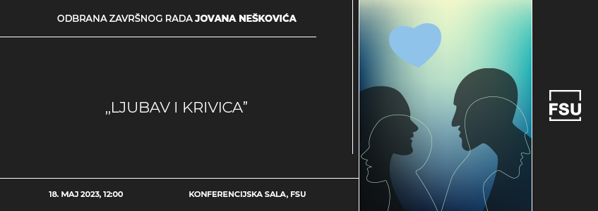 Odbrana master rada na master akademskim studijama kolege Jovana Neškovića pod nazivom „Ljubav i krivica”, kod mentora Vide Ognjenović, održaće se u četvrtak, 18. maja, od 12:00, u Konferencijskoj sali.