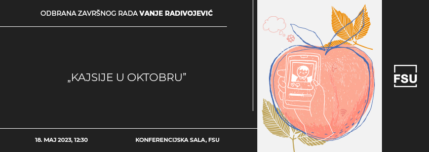 Odbrana master rada na master akademskim studijama koleginice Vanje Radivojević pod nazivom „Kajsije u oktobru”, kod mentora Vide Ognjenović, održaće se u četvrtak, 18. maja, od 12:30, u Konferencijskoj sali.