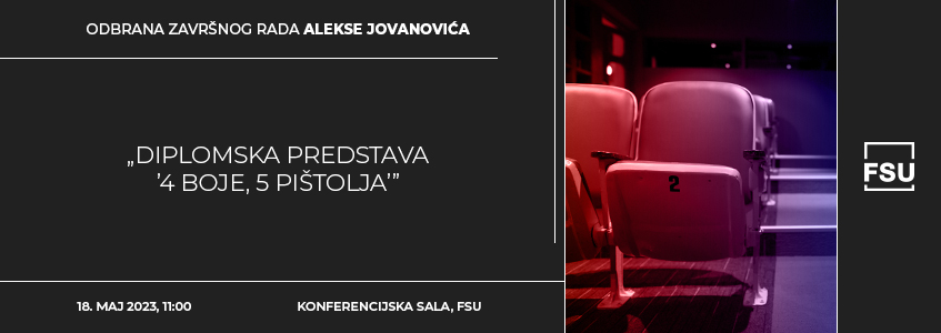 Odbrana završnog rada na osnovnim akademskim studijama kolege Alekse Jovanovića pod nazivom „Diplomska predstava ’4 boje, 5 pištolja’”, kod mentora Branislava Lečića, održaće se u četvrtak, 18. maja, od 11:00, u Konferencijskoj sali.