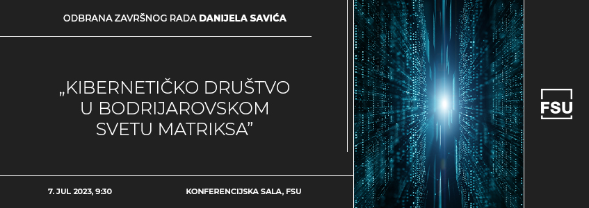 Odbrana završnog rada na osnovnim akademskim studijama kolege Danijela Savića pod nazivom „Kibernetičko društvo u bodrijarovskom svetu Matriksa”, kod mentora Dušana Stojakovića, održaće se u petak, 7. jula, s početkom u 9:30, u Konferencijskoj sali.