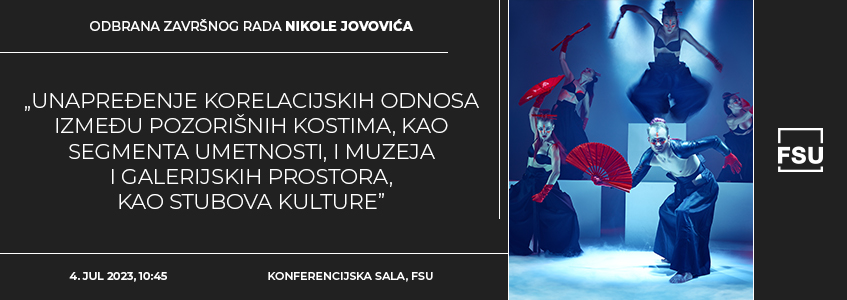 Odbrana završnog rada na osnovnim akademskim studijama kolege Nikole Jovovića pod nazivom „Unapređenje korelacijskih odnosa između pozorišnih kostima, kao segmenta umetnosti, i muzeja i galerijskih prostora, kao stubova kulture”, kod mentora Irine Tomić, održaće se u utorak, 4. jula, od 10:45, u Konferencijskoj sali.