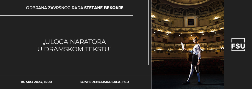 Odbrana završnog rada na osnovnim akademskim studijama koleginice Stefane Bekonje pod nazivom „Uloga naratora u dramskom tekstu”, kod mentora Branislava Lečića, održaće se u četvrtak, 18. maja, od 13:00, u Konferencijskoj sali.