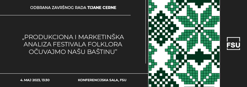 Odbrana završnog rada na osnovnim akademskim studijama koleginice Tijane Cerne pod nazivom „Produkciona i marketinška analiza festivala folklora Očuvajmo našu baštinu”, kod mentorke Nevenke Popović Šević, održaće se u četvrtak, 4. maja, od 13:30, u Konferencijskoj sali.