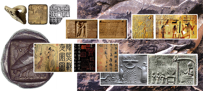 Rani pisani simboli su bili bazirani na piktogramima, slikama koje podsećaju na ono na šta se odnose, i ideogramima, gde slike predstavljaju ideje na koje se odnose. Oni su baza iz koje su nastali klinasto pismo i hijeroglifi. Veruje se da su se piktogrami pojavili pre ideograma i da su ih drevne kulture širom sveta upotrebljavale već od 9000. godine pre nove ere, a da su se kasnije, oko 5000. godine p.n.e, razvili u logografske pisane sisteme u kojima simbol označava određenu reč ili rečenicu.