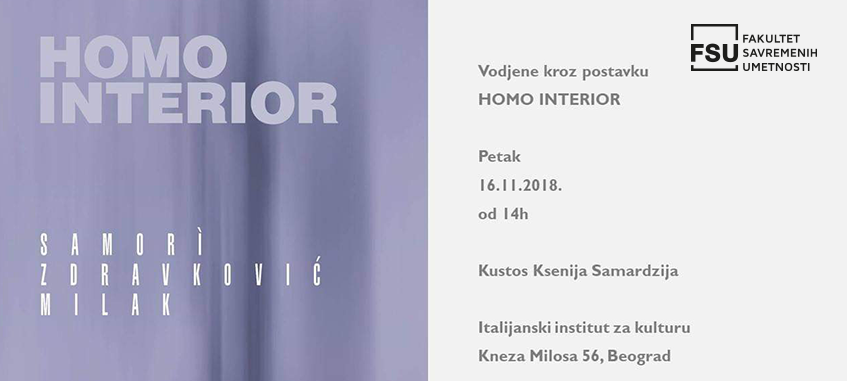Izložba „Homo Interior” povezuje tri različita vizuelna promišljanja u jedinstvenu postavku. Radovi umetnika koji potiču iz različitih sredina koje su određene tradicijom i geografski bliske povezani su kroz intuitivno razumevanje klasičnog slikarskog jezika. Izložba u Italijanskom institutu za kulturu u Beogradu zadržava latinski naziv koji ne zahteva prevod.