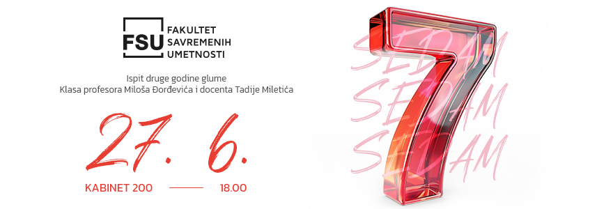 Imamo zadovoljstvo da Vas pozovemo da pogledate ispitnu predstavu „Sedam“, koja je ujedno i završni ispit druge godine Glume na Fakultetu savremenih umetnosti. Predstava je rezultat kreativnog rada i truda naših talentovanih studenata pod mentorstvom profesora Miloša Đorđevića i docenta Tadije Miletića.