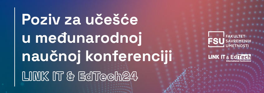 Fakultet savremenih umetnosti, Visoka škola strukovnih studija za informacione tehnologije i Institut za moderno obrazovanje pozivaju vas na drugu LINK IT & EdTech međunarodnu konferenciju – LINK IT & EdTech24, koja će se održavati 24. i 25. maja 2024. godine u hibridnom formatu – u Palati Beograd (Masarikova 5) i putem lajvstrima.