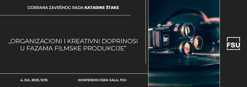 Odbrana završnog rada na osnovnim akademskim studijama koleginice Katarine Štake pod nazivom „Organizacioni i kreativni doprinosi u fazama filmske produkcije”, kod mentora Miloša Babića, održaće se u utorak, 4. jula, od 12:15, u Konferencijskoj sali.