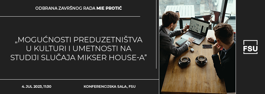 Odbrana završnog rada na osnovnim akademskim studijama koleginice Mie Protić pod nazivom „Mogućnosti preduzetništva u kulturi i umetnosti na studiji slučaja Mikser House-a”, kod mentora Maje Vukadinović, održaće se u utorak, 4. jula, od 11:30, u Konferencijskoj sali.
