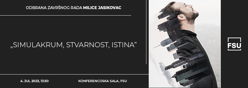 Odbrana završnog rada na osnovnim akademskim studijama koleginice Milice Jasikovac pod nazivom „Simulakrum, stvarnost, istina”, kod mentora Dušana Stojakovića, održaće se u utorak, 4. jula, s početkom u 13:30, u Konferencijskoj sali.