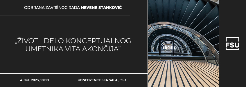 Odbrana završnog rada na osnovnim akademskim studijama koleginice Nevene Stanković pod nazivom „Život i delo konceptualnog umetnika Vita Akončija”, kod mentora Dragana Ćalovića, održaće se u utorak, 4. jula, s početkom u 10:00, u Konferencijskoj sali.