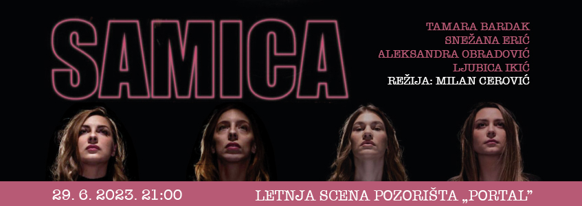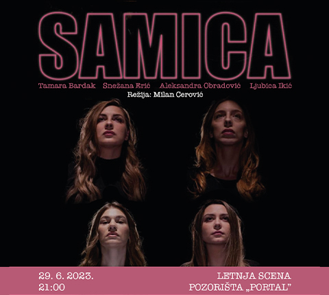 Pozivamo vas da dođete na izvođenje predstave „Samica”, koja će se održati u četvrtak, 29. juna, s početkom u 21:00, na Letnjoj sceni pozorišta „Portal”. Režiju predstave potpisuje Milan Cerović, dok je autor Milena Depolo.