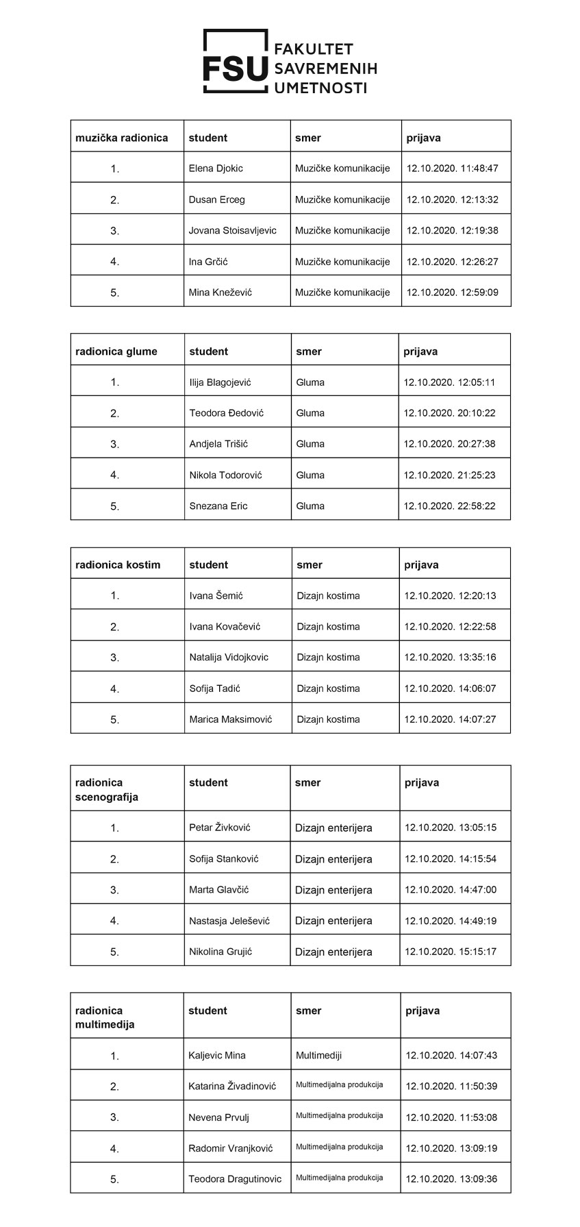 Za radionicu je vladalo veliko interesovanje – prijavilo se preko 80 studenata. Selekciju smo pravili prema smeru i vremenu prijave. Hvala svima koji su se prijavili i želeli da učestvuju. Svi zainteresovani će brzo imati sledeću priliku jer će uskoro biti objavljen naredni termin za druge umetničke radionice u okviru galerije FSU.
