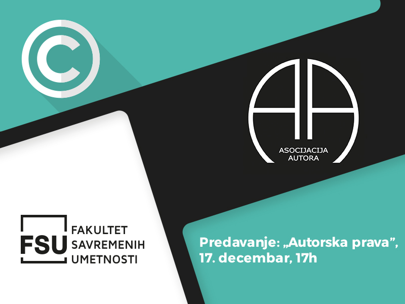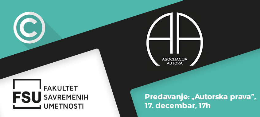 Fakultet savremenih umetnosti organizuje predavanje na temu autorskih prava u utorak, 17. decembra, od 17 časova, u amfiteatru FSU. Ovo je odlična prilika za sve sadašnje i buduće umetnike da se upoznaju sa svim zakonskim regulativama koje se odnose na ovu oblast.