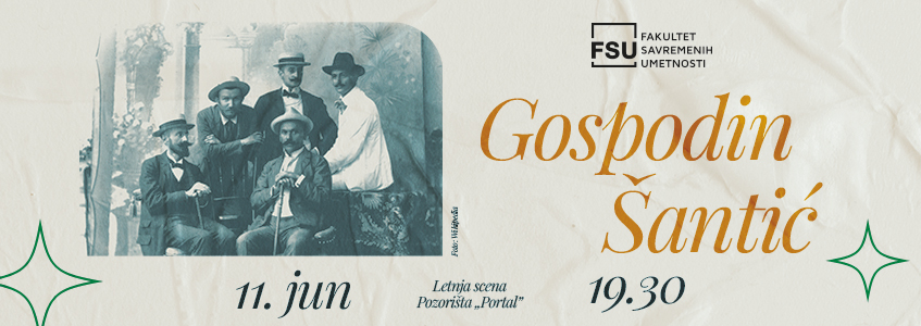 Predstava „Gospodin Šantić”, koju igraju studenti osnovnih i master studija, održaće se u utorak, 11. juna, s početkom u 19.30, na Letnjoj sceni Pozorišta „Portal”, na Fakultetu savremenih umetnosti (Svetozara Miletića 12, Beograd).