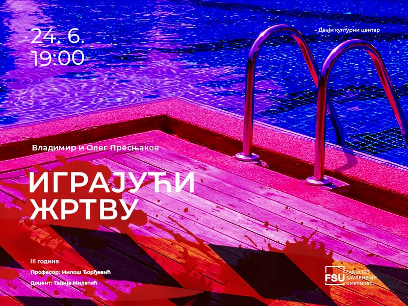 Studenti treće godine glume Fakulteta savremenih umetnosti, čiju klasu vode profesor Miloš Đorđević i docent Tadija Miletić, pozivaju vas na izvođenje svoje diplomske predstave „Igrajući žrtvu”, po komadu Vladimira i Olega Presnjakova, koja će se odigrati na sceni Dečjeg kulturnog centra u petak, 24. juna, s početkom u 19:00. Ulaz na predstavu je besplatan.