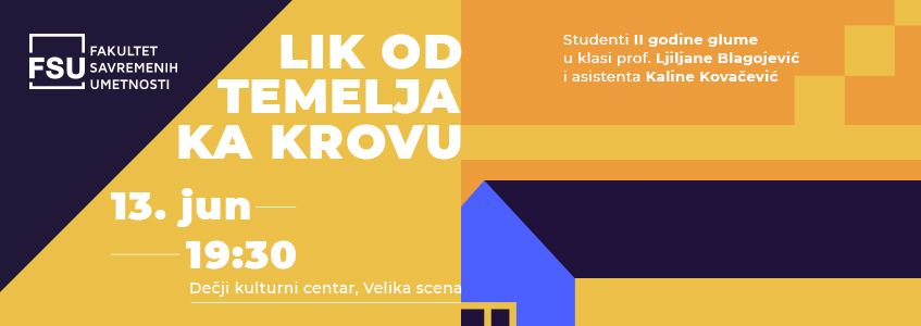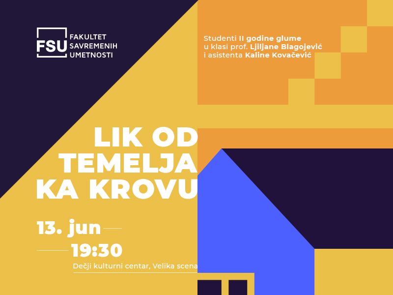 Studenti druge godine glume sa Fakulteta savremenih umetnosti pozivaju vas na svoju završnu predstavu „Lik od temelja ka krovu”, koju će odigrati u Velikoj sali Dečjeg kulturnog centra u ponedeljak, 13. juna, od 19:30. Ulaz na predstavu je besplatan.